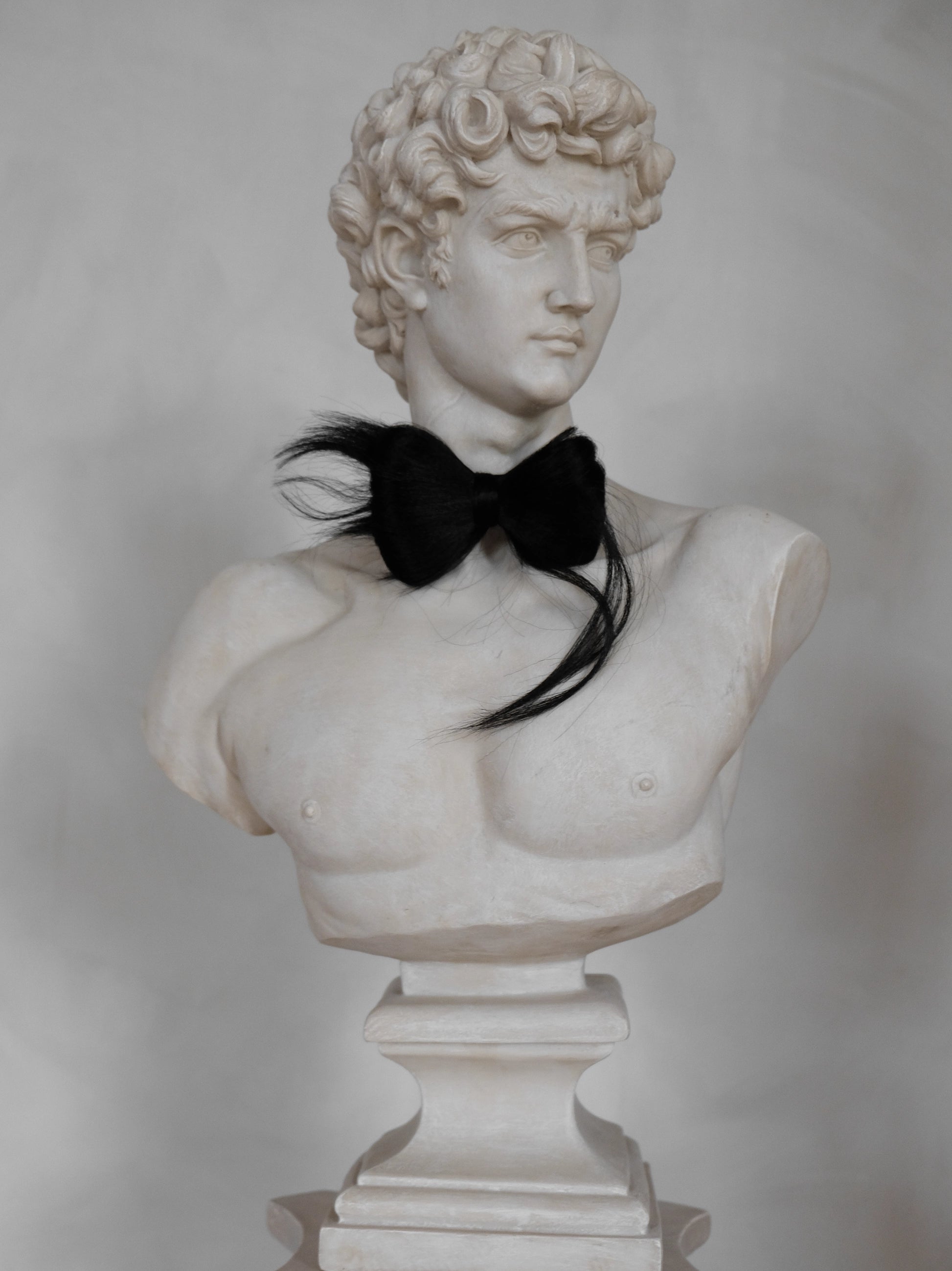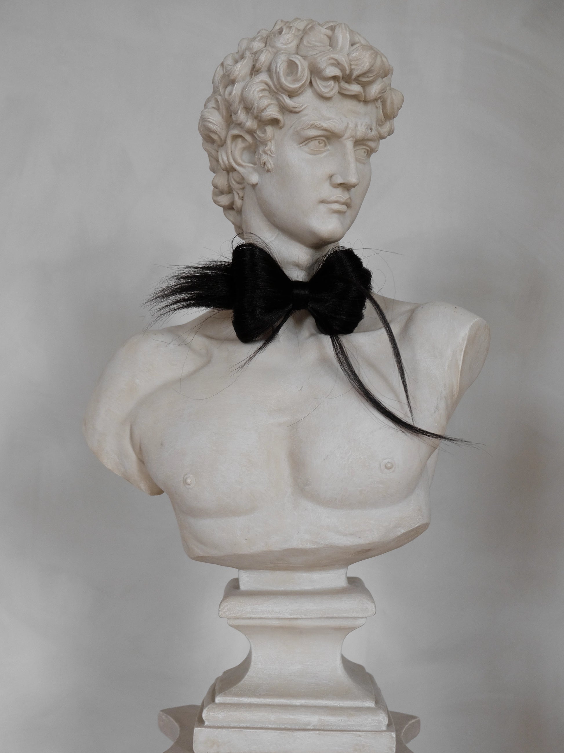 A surreal bow for the neck, this hair-crafted adornment draws on the playful rebellion of Méret Oppenheim and the sharp, couture surrealism of Elsa Schiaparelli. Made from silky synthetic hair and shaped entirely by hand, it sits at the edge of accessory and art objects, tactile and effortlessly cool.